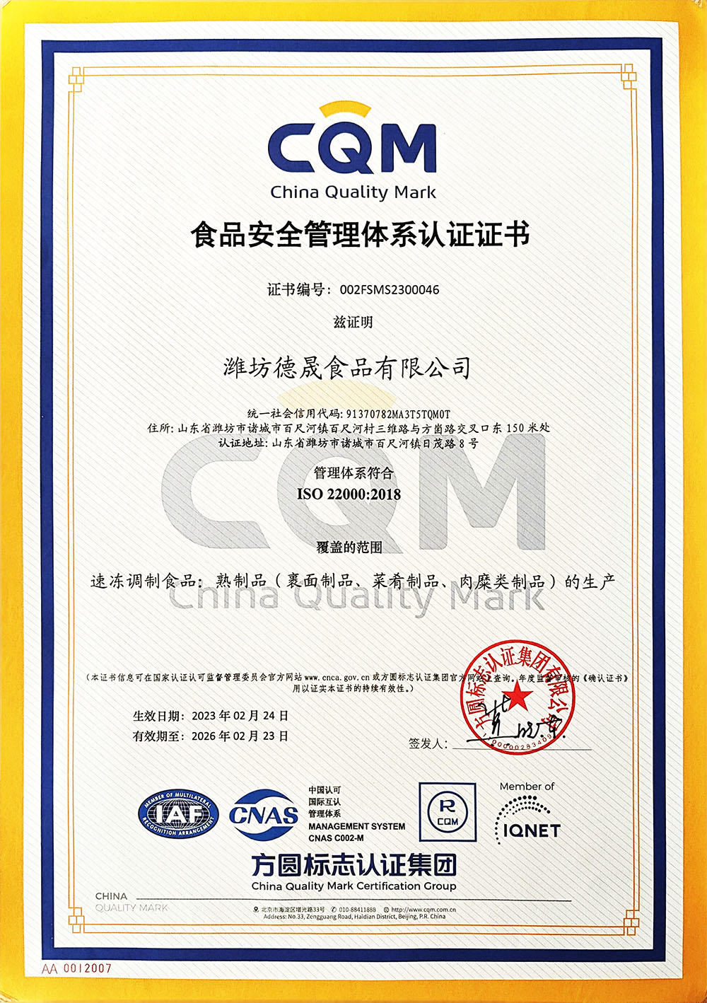 食品安全管理体系认证证书